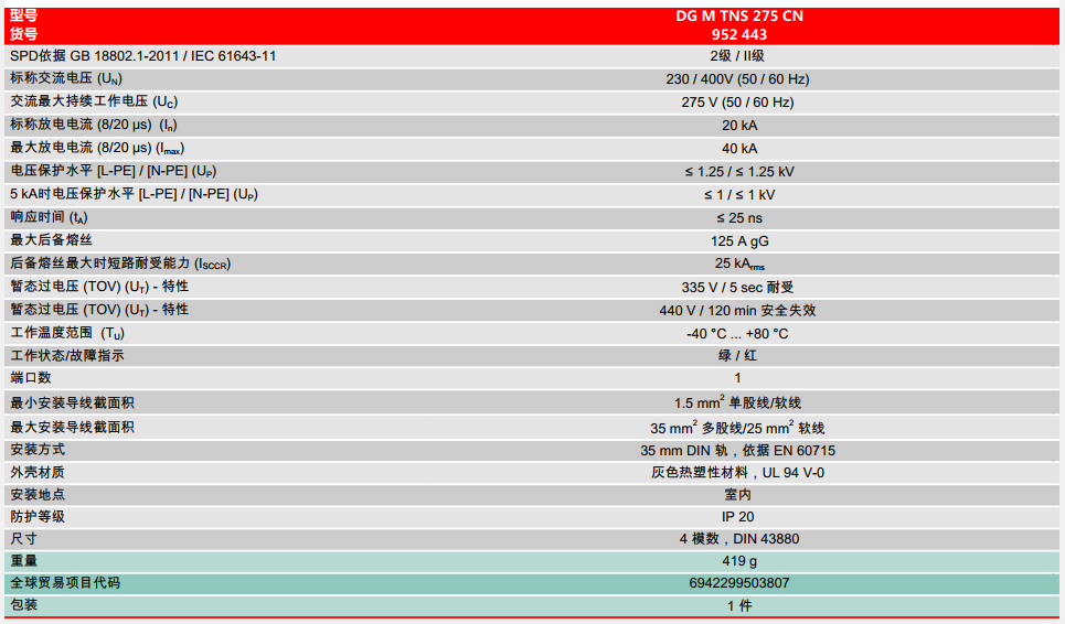 Ⅱ+Ⅲ级电源防雷器DG 275系列
